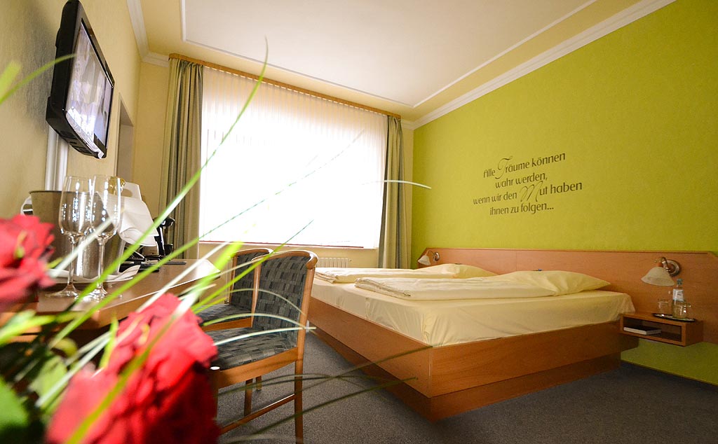 | Komfort-Doppelzimmer im Haupthaus mit Dusche/WC, Flat-Kabel-TV, DSL Anschluss per W-LAN, Telefon, Tassimo-Kaffeemaschine mit Zubehör, 1 Flasche Mineralwasser, Musikanlage im Zimmer, Schreibtisch mit Arbeitsfläche, Zimmersafe, Hotelzeitung zum Frühstück, Körperpflegeartikeln, Kosmetikspiegel und Haartrockner. In dieser Kategorie gibt es Raucher- und Nichtraucherzimmer. |